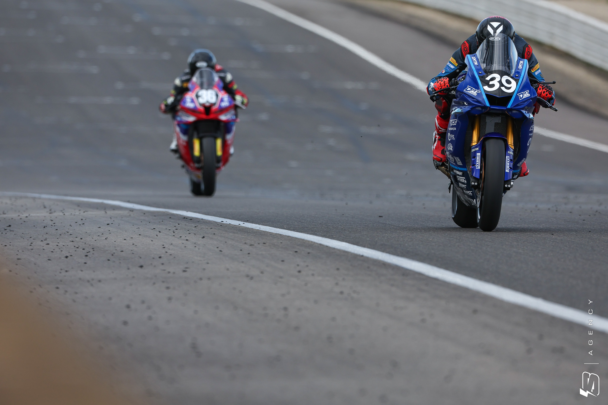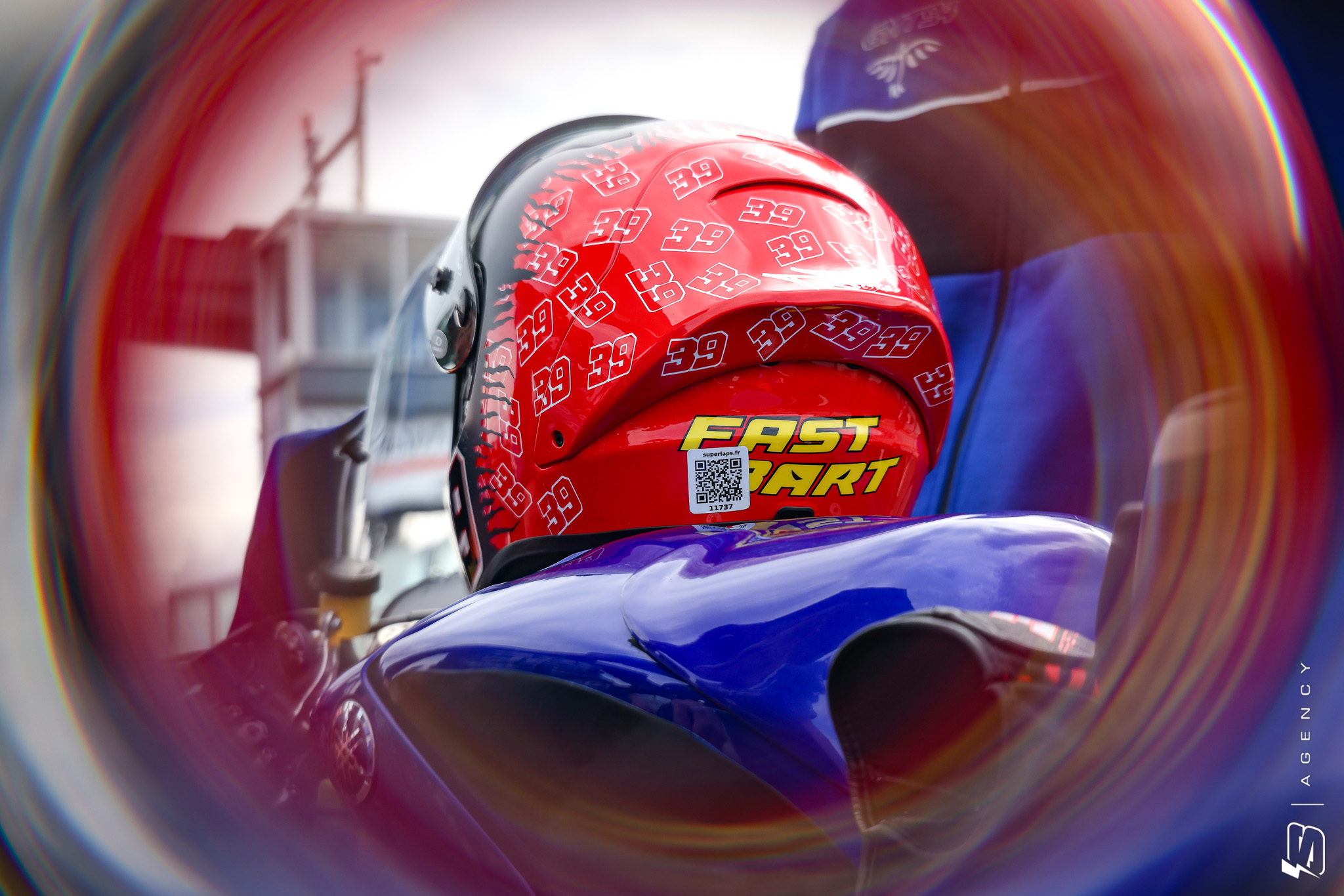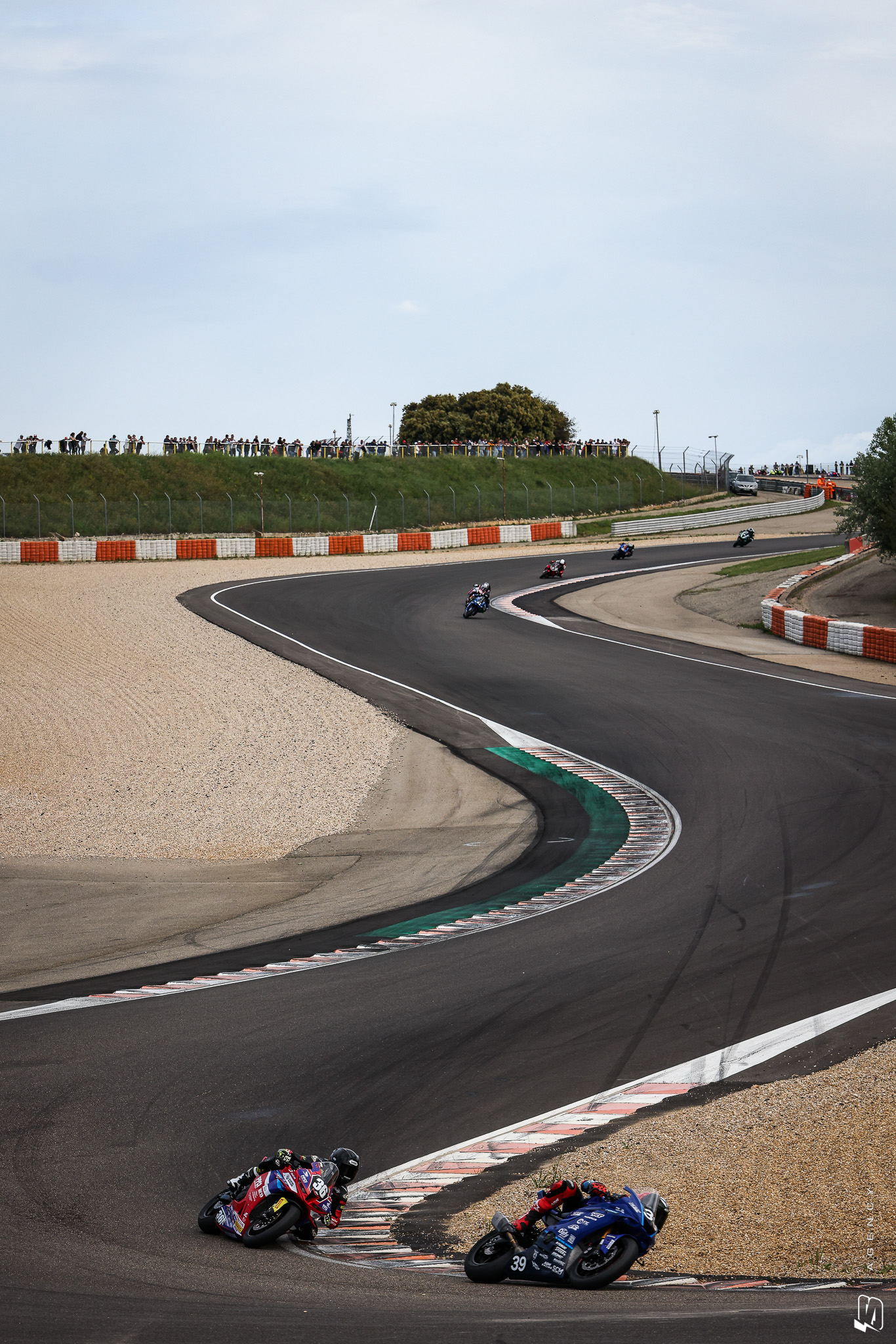 La première manche s’est déroulée dans des conditions extrêmement incertaines, où le choix des pneus était un véritable casse-tête entre le « slick » et le « pluie ». Nous avons finalement opté pour un pneu pluie à l’avant et un intermédiaire à l’arrière. Malheureusement, ce n’était pas le choix optimal face à des adversaires partis en slicks. Malgré ce handicap technique, je me suis démené pour rester aux avant-postes. Au prix d’un gros effort, je termine à une superbe 2ème place, échouant de très peu derrière le vainqueur.